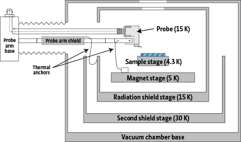 The CPX-VF is designed to enable true 90° wafer probing on wafers up to 51 mm (2 in) in diameter. The sample can be maintained at elevated temperature during cooldown reducing the potential for condensation, a critical requirement for measuring organic materials. The continuous refrigeration station uses liquid helium and can be operated with liquid nitrogen; however, the superconducting magnet requires liquid helium to operate. The CPX-VF operates over a temperature range of 4.2 K to 400 K with the option to extend the base temperature to 2 K.